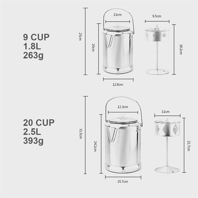 1.5L (9-কাপ) ক্ষমতা সহ, আপনি একসাথে একাধিক লোকের জন্য কফি তৈরি করতে পারেন, এটি ছোট ক্যাম্পিং গ্রুপ, পারিবারিক আউটিং বা বন্ধুদের জমায়েতের জন্য উপযুক্ত করে তোলে।